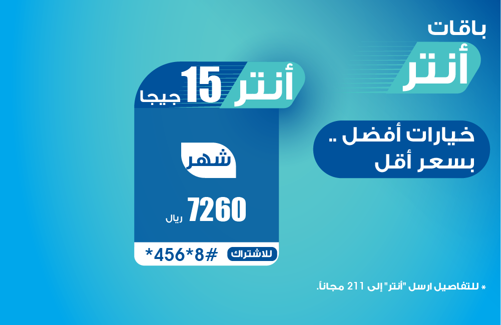 | أنتر 15 جيجا | 15 جيجا فورجي | 30 يوم | 600 | 7260 | 8#*456* | 122#* |