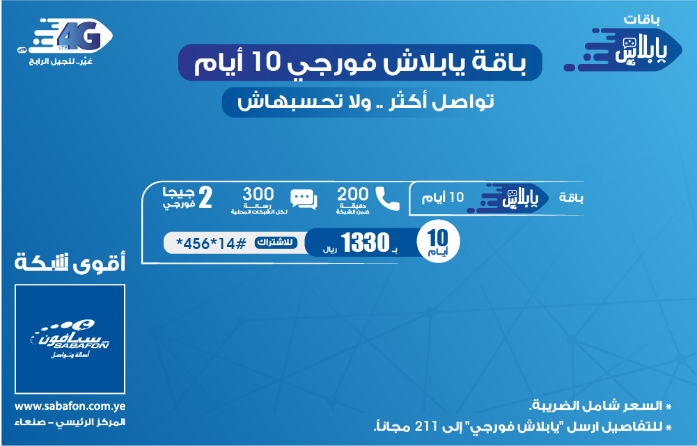 | يابلاش فورجي 10 أيام | 200 دقيقة | 300 رسالة | 2 جيجا | 10 أيام | 1330 | 109.92 | 14#*456* |